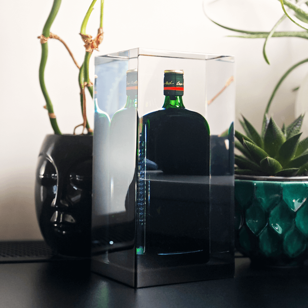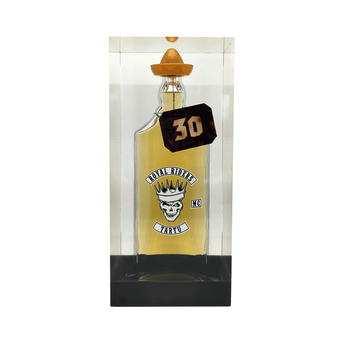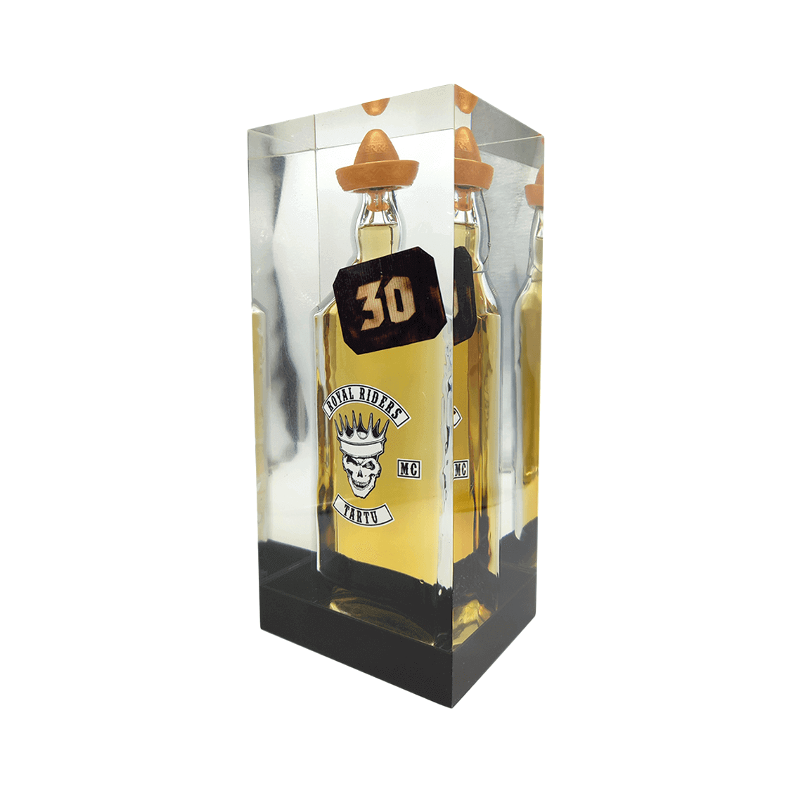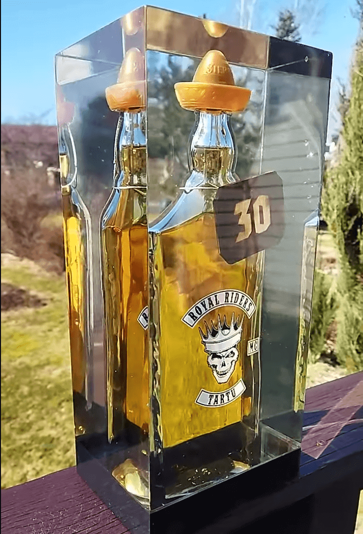 Epoksiidvaiku valatud (näidisel 1 liitrine tekiila) pudel. Kingitusele on võimalik graveerida.